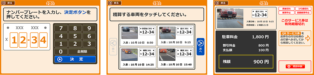 精算は事前精算機に利用者が車両ナンバーを入力し車両を確認。その画像をタップすると料金が表示されますので、その案内に従い支払いを行います。割引等はQRコードのついたレシートをリーダーにかざします。
